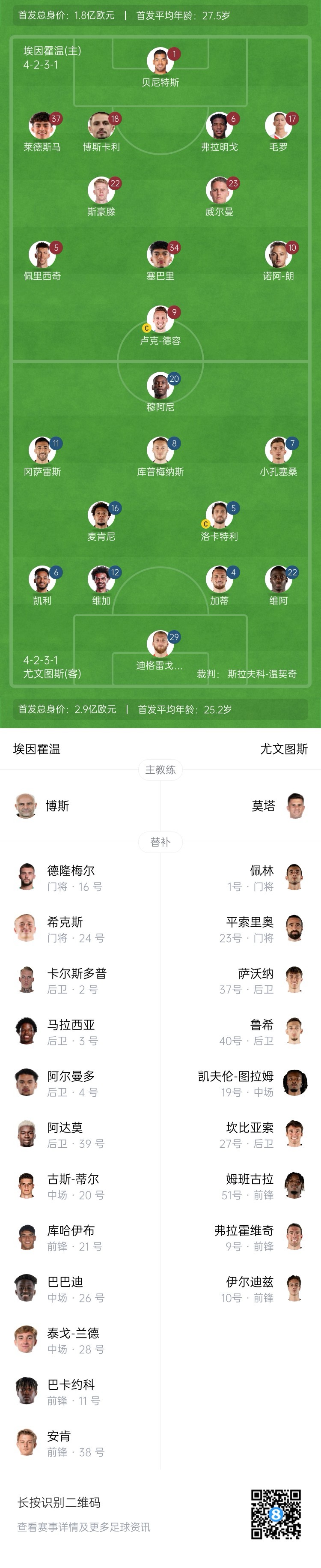 埃因霍溫替補(bǔ):16-德隆梅爾、24-??怂埂?-卡爾斯多普、3-馬拉西亞、4-阿爾曼多、39-阿爾莫、20-古斯-蒂爾、21-庫哈伊布、26-巴巴迪、28-泰戈-蘭德、11-約翰-巴卡約科、38-安肯