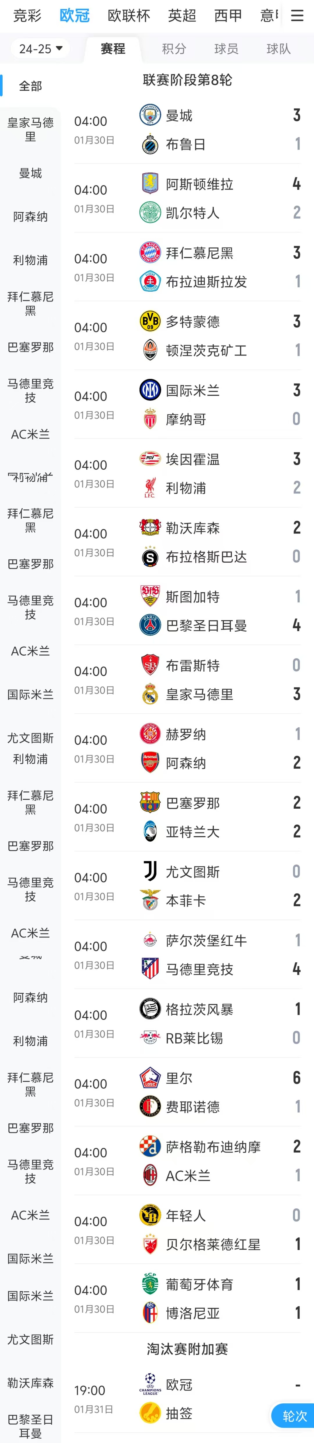 01月30日訊 北京時間1月30日星期四04:00,歐冠聯(lián)賽階段第8輪,18場比賽同時開打,歐冠聯(lián)賽階段收官戰(zhàn)綜述如下!