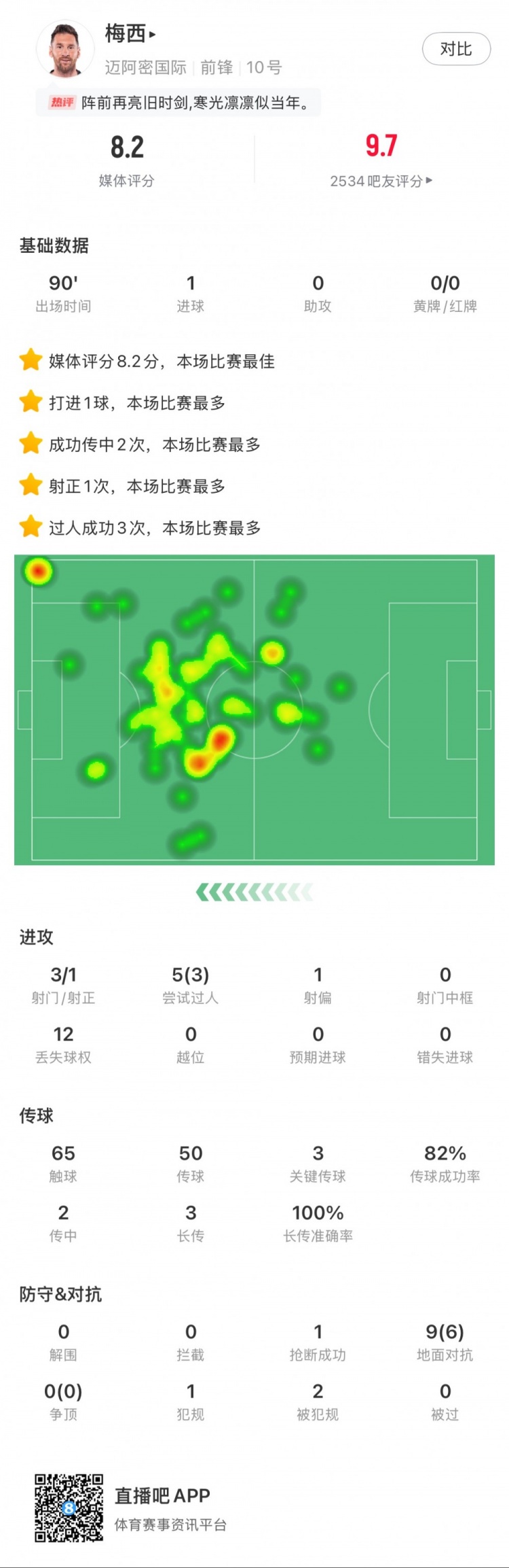 梅西本場數(shù)據(jù):進(jìn)1球,3次射門,3次關(guān)鍵傳球,3次成功過人