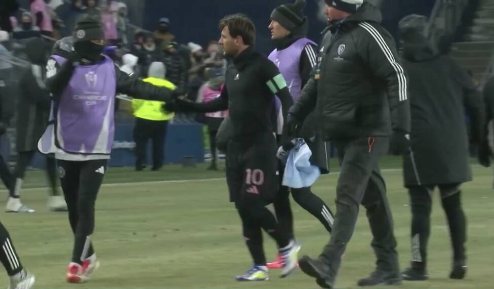 邁阿密1-0戰(zhàn)勝堪薩斯城,梅西本場比賽制勝,賽后梅西與對手球員換球衣,當(dāng)?shù)貧鉁亓阆?4℃,梅西穿了厚厚的保暖服。