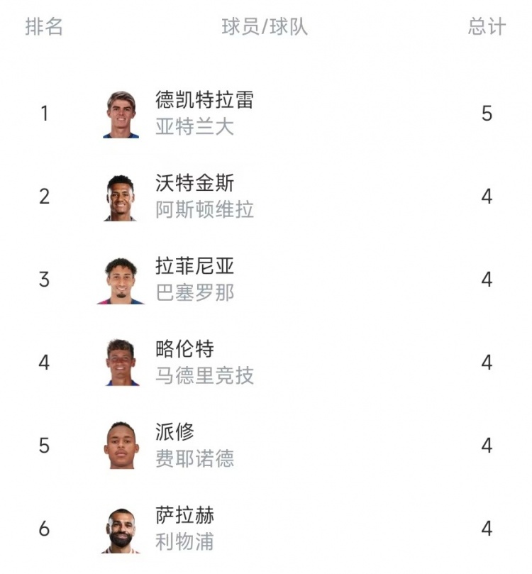 歐冠助攻榜:德凱特拉雷5助居首,拉菲尼亞、薩拉赫4助