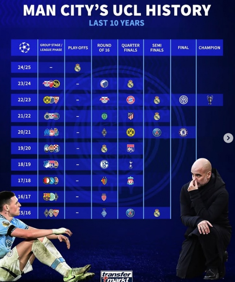 曼城近10年歐冠戰(zhàn)績:4次被皇馬淘汰,4進(jìn)4強、2進(jìn)決賽+1奪冠