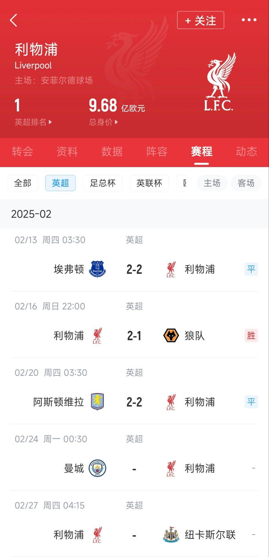 02月20日訊 利物浦在今天凌晨的一場英超比賽2-2戰(zhàn)平維拉,現(xiàn)多賽一場8分領(lǐng)跑英超。