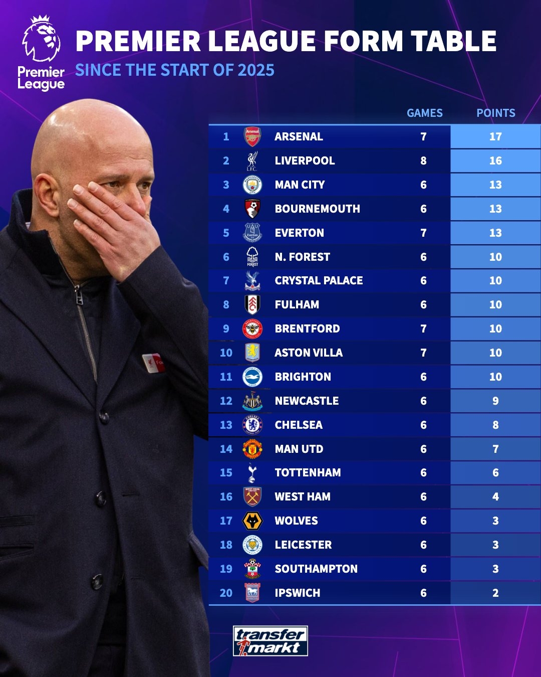 2月20日訊 德國轉(zhuǎn)會市場統(tǒng)計(jì)了2025年開始至今英超球隊(duì)拿到的積分,并列出榜單,阿森納17分居首,利物浦16分次席。