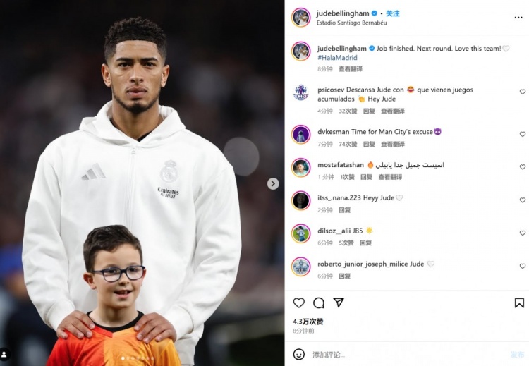 貝林厄姆也在賽后通過(guò)社媒曬出自己的比賽照,并配文:“任務(wù)完成!晉級(jí)下一輪。我愛(ài)這支球隊(duì)!”
