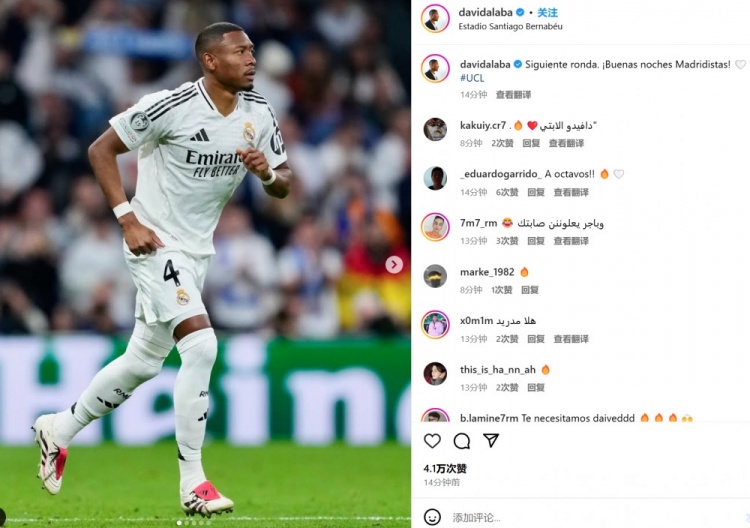 2月20日訊 皇馬在本輪歐冠3-1擊敗曼城,阿拉巴傷愈復(fù)出,在最后時刻替補登場。