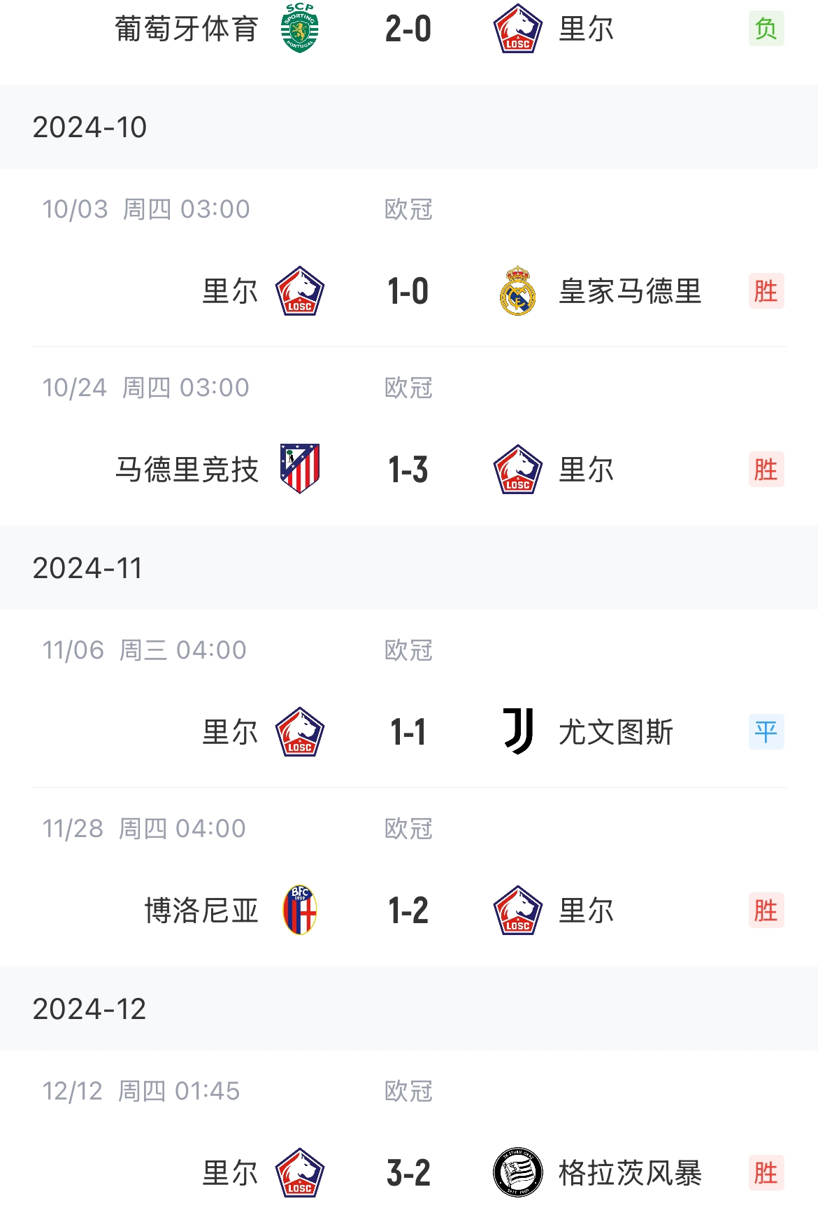 聯(lián)賽階段,里爾還爆冷戰(zhàn)勝皇馬和馬競,戰(zhàn)平了尤文,最后一輪6-1大勝費耶諾德,最終排名第七直接晉級16強。