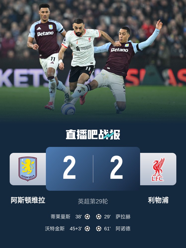 英超第29輪,利物浦2-2戰(zhàn)平維拉。上半場,加西亞回傳送禮,若塔搶斷后助攻薩拉赫破門,蒂萊曼斯扳平,沃特金斯頭球助維拉反超;下半場,薩拉赫助攻阿諾德進(jìn)球,利物浦扳平比分,努涅斯屢次錯失良機(jī)。