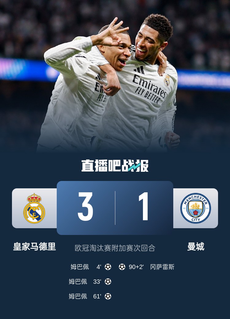 姆巴佩戴帽!皇馬3-1曼城總比分6-3晉級16強(qiáng) 下輪戰(zhàn)馬競或藥廠