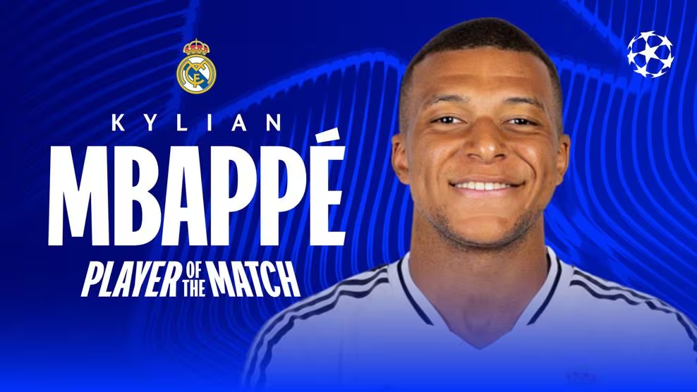 帽子戲法!歐冠官方:姆巴佩當(dāng)選皇馬vs曼城全場最佳