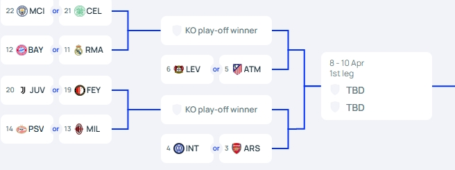 此外,皇馬、曼城、拜仁、馬競和勒沃庫森,他們的1/4決賽對手將從米蘭、尤文、阿森納和國米中產(chǎn)生。