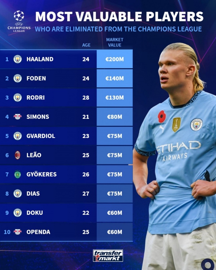 歐冠出局球員身價(jià)榜:哈蘭德2億歐居首,前10名曼城占6席
