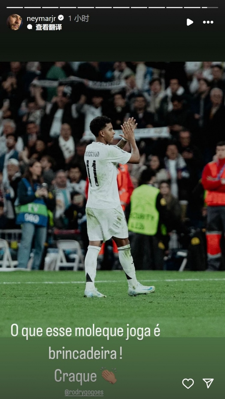 內(nèi)馬爾更新社媒動態(tài),曬出羅德里戈的照片,配文:“這個小伙子踢得太好了!王牌。”