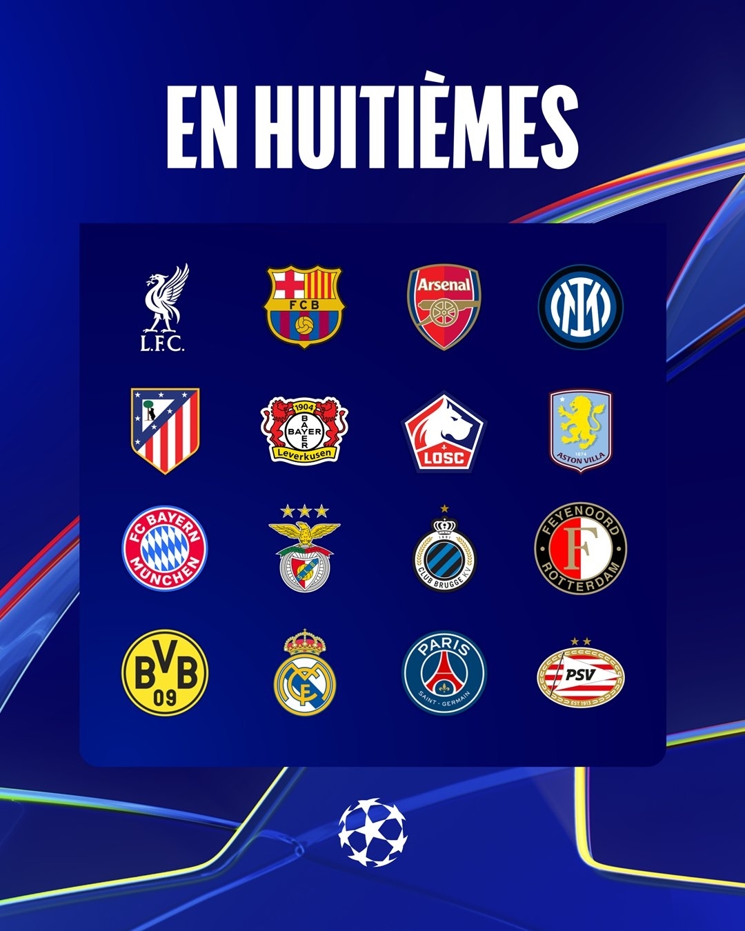 歐冠16強(qiáng):利物浦、巴薩、阿森納、國(guó)米、馬競(jìng)、勒沃庫(kù)森、里爾、維拉、本菲卡、拜仁、費(fèi)耶諾德、布魯日、多特、巴黎、皇馬、埃因霍溫