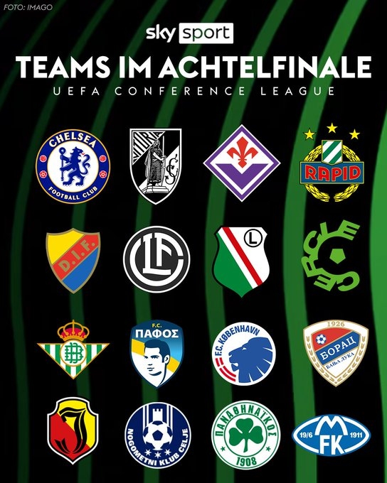 歐協(xié)聯(lián)16強(qiáng):切爾西、吉馬良斯、佛羅倫薩、維也納快速、尤爾加登、盧加諾、華沙萊吉亞、色格拉布魯日、貝蒂斯、哥本哈根、帕福斯、巴尼亞盧卡戰(zhàn)士、帕納辛奈科斯、采列、喬治羅尼亞、莫爾德