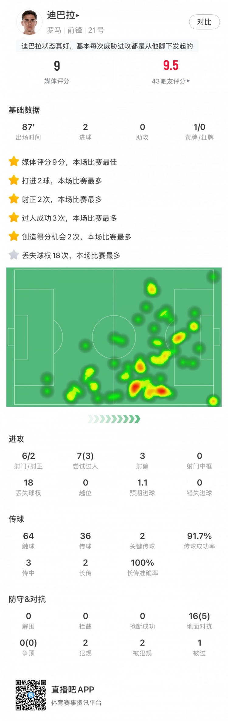 迪巴拉全場數(shù)據(jù):2粒進(jìn)球,2次創(chuàng)造得分機(jī)會,3次成功過人