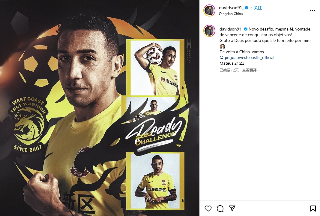 2月21日訊 正式加盟青島西海岸后,戴維森更新社媒,表達(dá)了自己重返中超的感言。