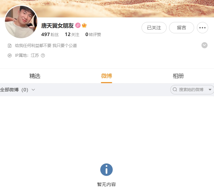 控訴唐天翼的女生改微博簡(jiǎn)介:給我任何利益都不要,我只要個(gè)公道
