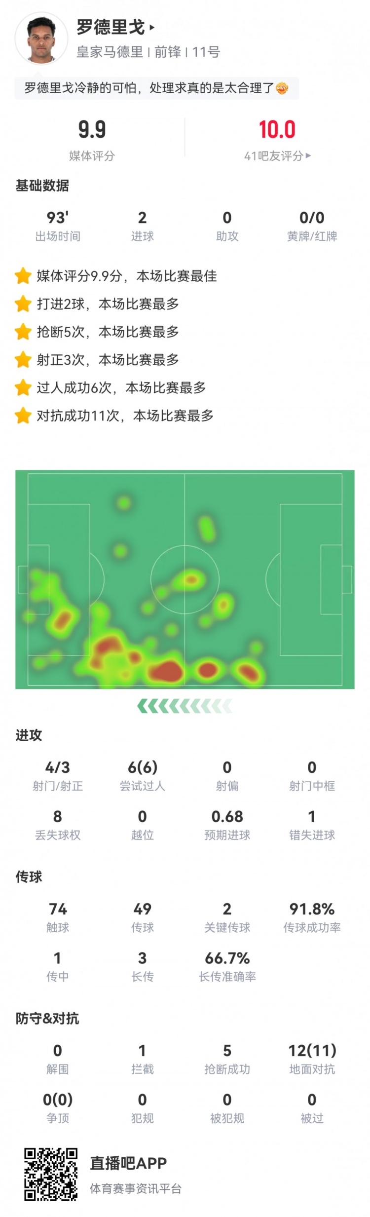 羅德里戈數(shù)據(jù):2粒進(jìn)球,6次過人全成功,11次成功對(duì)抗,評(píng)分9.9