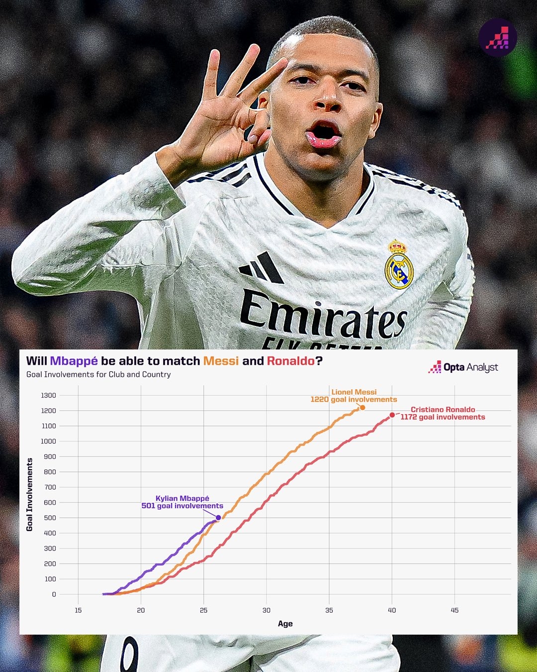 梅羅均破千!姆巴佩生涯直接參與501球 與同年齡梅西相當(dāng)&高于C羅