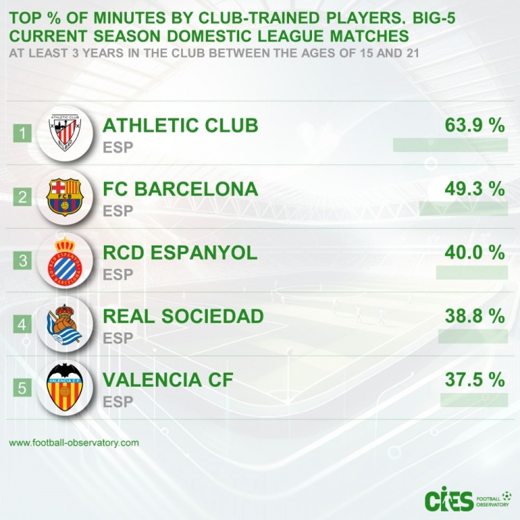 2月22日訊 瑞士足球天文臺(tái)統(tǒng)計(jì)了本賽季五大聯(lián)賽球隊(duì)自家青訓(xùn)球員的出場(chǎng)時(shí)間占全隊(duì)的比例,并列出榜單,畢爾巴鄂63.9%居首,巴薩49.3%第二,前5名皆為西甲球隊(duì)。