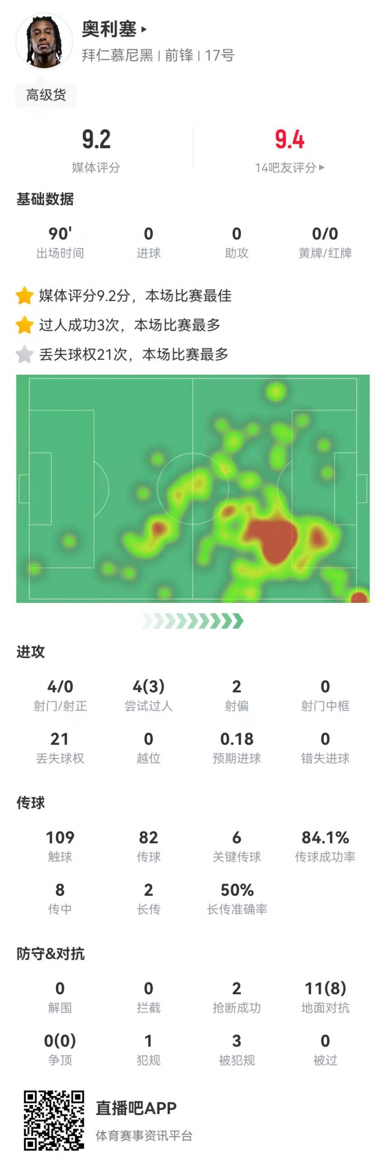 奧利塞本場6關(guān)鍵傳球+2造良機(jī)+8成功對抗+3造犯規(guī),9.2分全場最高