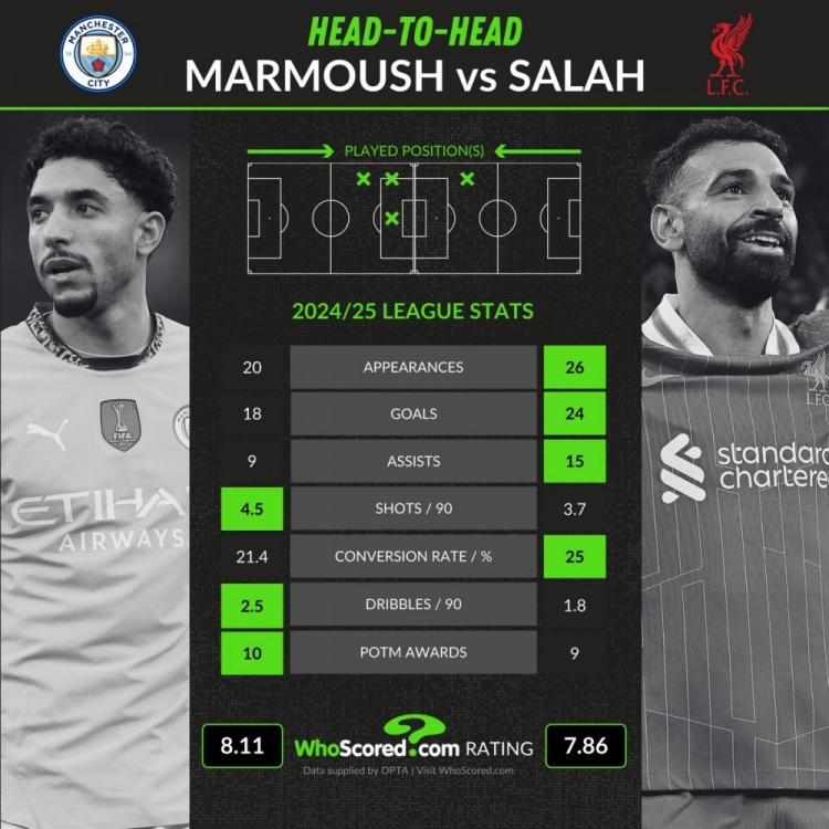 2月22日訊 曼城將在本輪英超焦點(diǎn)戰(zhàn)主場迎戰(zhàn)利物浦,馬爾穆什和薩拉赫將上演開羅德比,whoscored也列出了兩人本賽季聯(lián)賽關(guān)鍵數(shù)據(jù)對比。