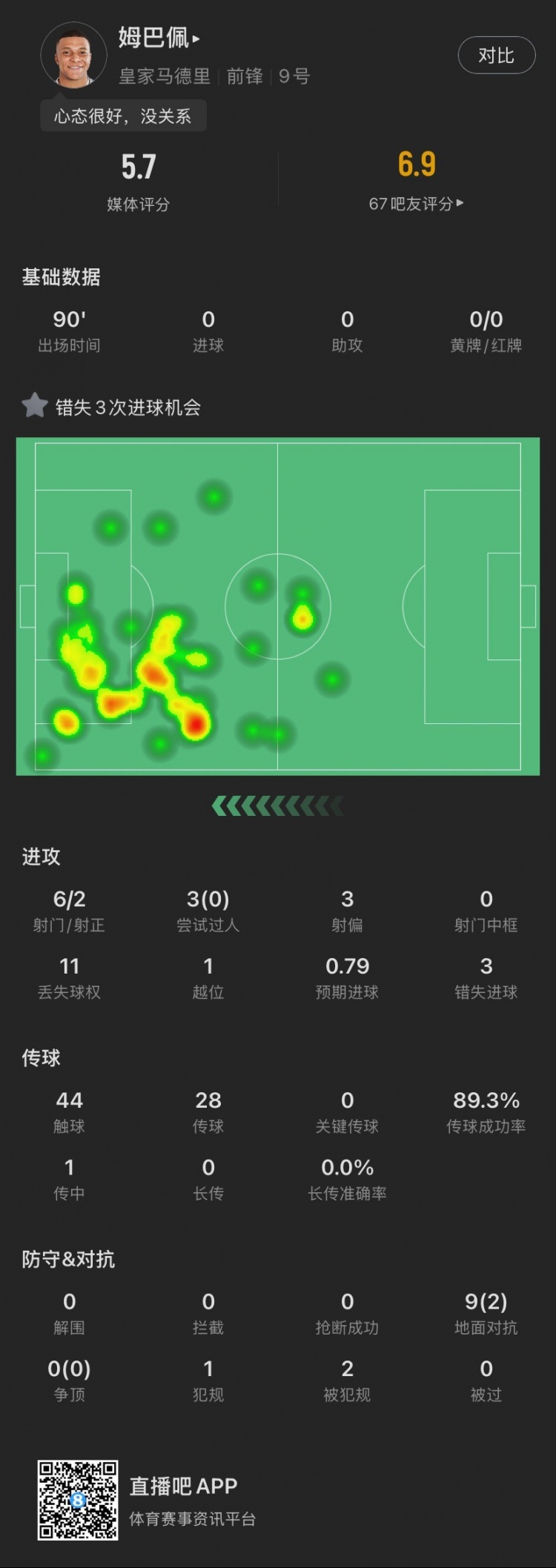 姆巴佩本場:錯失3次良機(jī),3次過人0成功,1越位,5.7分全場最低