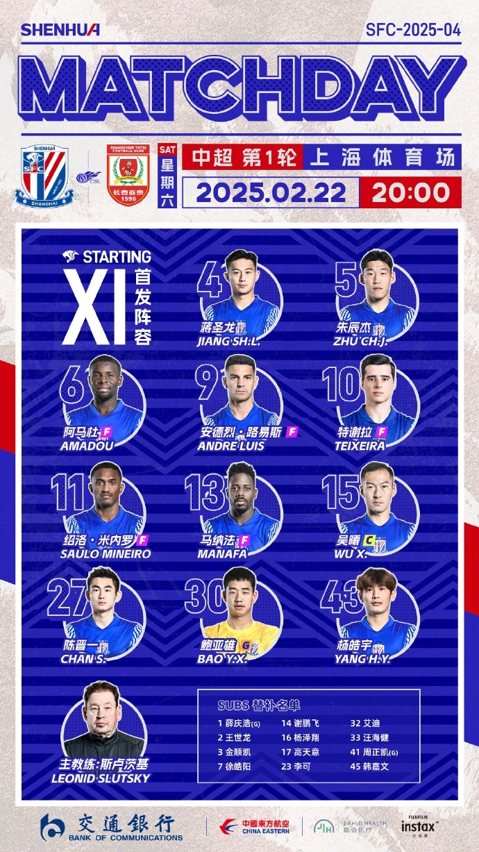 2025中超聯(lián)賽第1輪 上海申花vs長春亞泰 首發(fā)名單