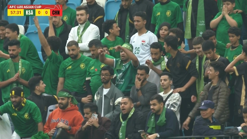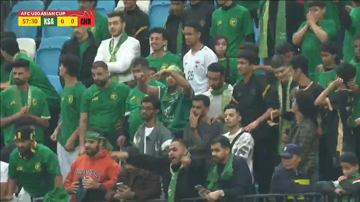 看臺(tái)沙特球迷目睹主裁判給中國隊(duì)點(diǎn)球,比劃手抗議示意看VAR