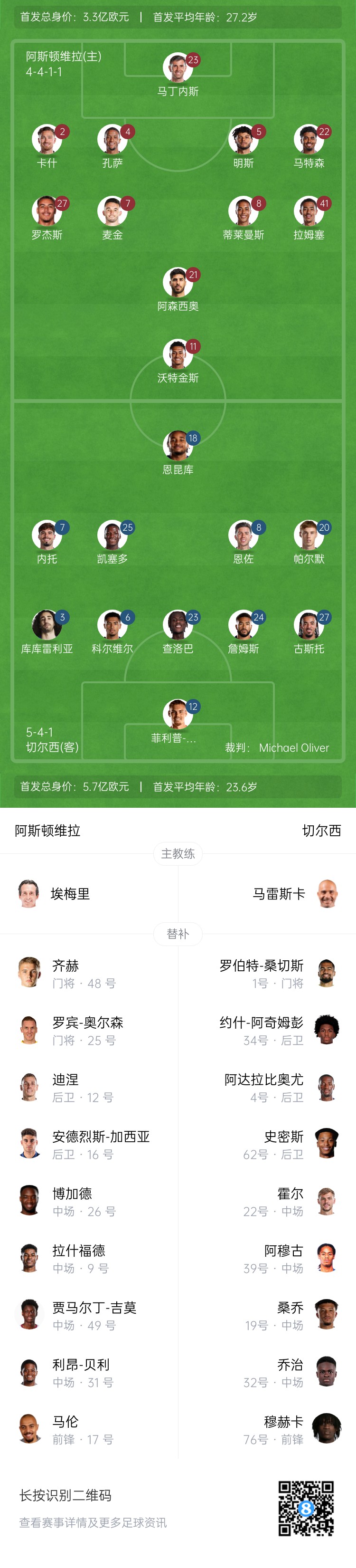 維拉首發(fā):23-馬丁內(nèi)斯、2-卡什、4-孔薩、5-明斯、22-馬特森、7-麥金、8-蒂萊曼斯、21-阿森西奧、41-雅各布-拉姆塞、27-摩根-羅杰斯、11-沃特金斯