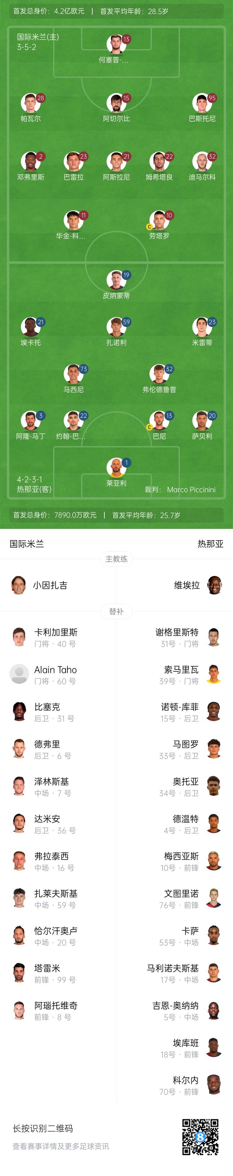 熱那亞替補:31-西格里斯特、39-索馬里瓦、4-德溫特、5-讓-奧納納、10-梅西亞斯、15-布魯克-庫菲、17-馬利諾夫斯基、18-埃庫班、33-馬圖羅、53-卡薩、70-科爾內(nèi)、76-文圖里諾