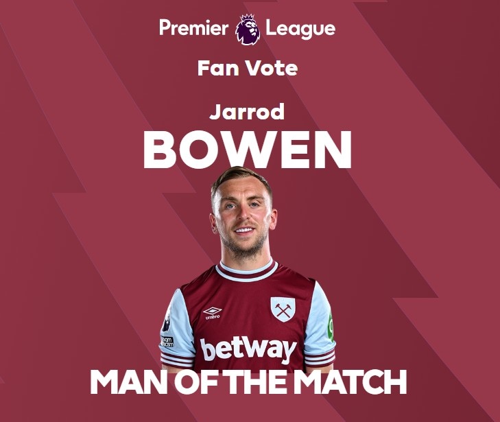 本場比賽西漢姆球員鮑文打進(jìn)唯一進(jìn)球,賽后他也當(dāng)選英超官方球迷票選全場最佳球員。