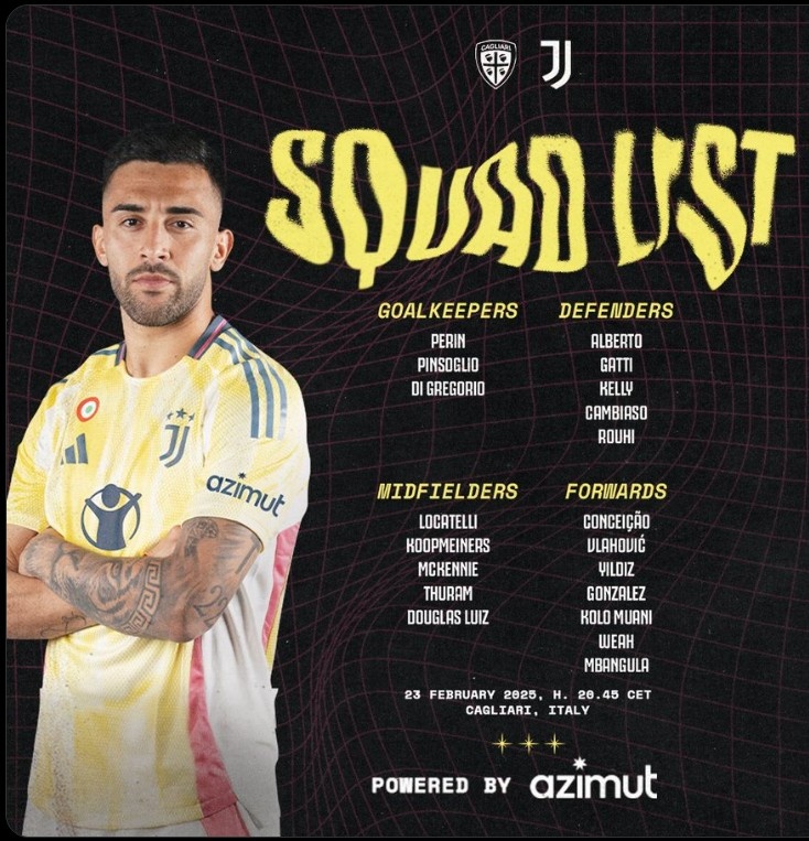 2月23日訊 本輪意甲尤文將對陣卡利亞里,球隊官方也公布了本場大名單,具體如下: