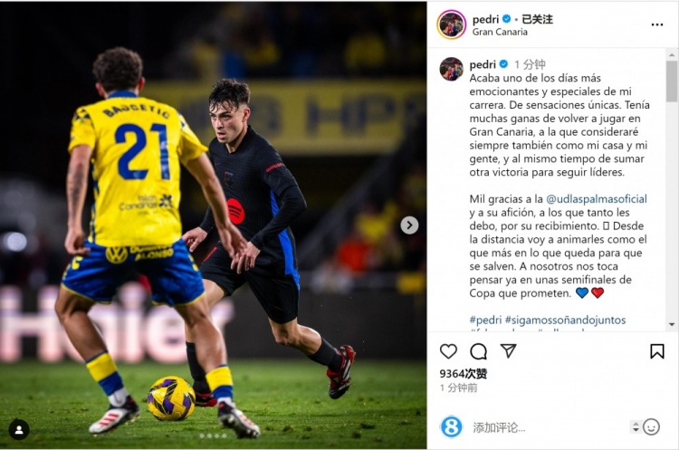 佩德里賽后在社交媒體上寫道:“我職業(yè)生涯中最激動人心、最特別的日子之一結(jié)束了,這是獨一無二的感覺。我真的很期待再次在大加那利球場比賽,我將永遠把這里視為我的家,將你們視為我的球迷。同時再次取得勝利,繼續(xù)保持領(lǐng)跑位置。”