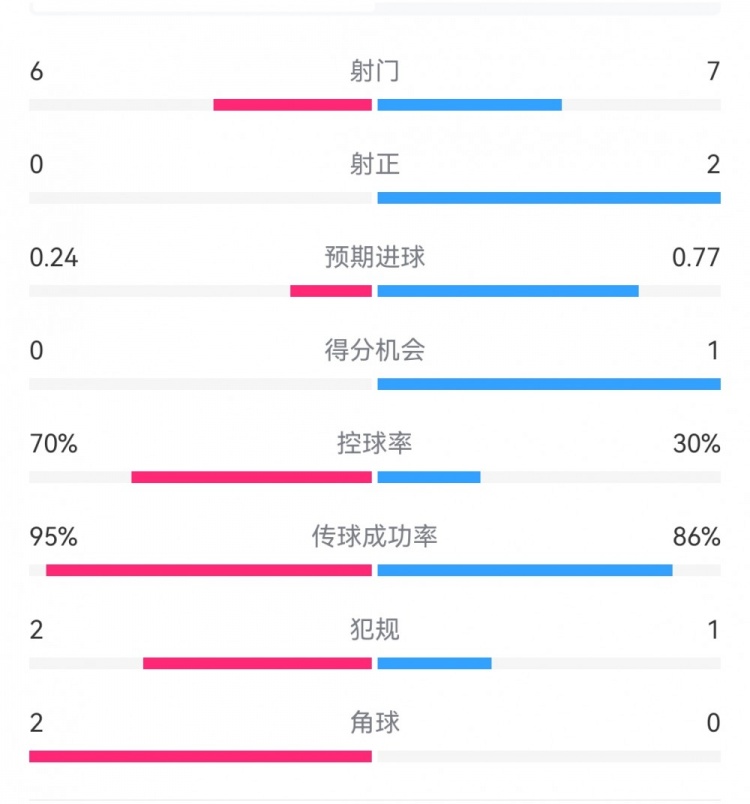 1月30日訊 歐冠末輪,曼城半場0-1落后布魯日,若不勝曼城將被淘汰。雙方半場重點數(shù)據(jù)對比如下↓(主隊曼城在前,客隊布魯日在后)
