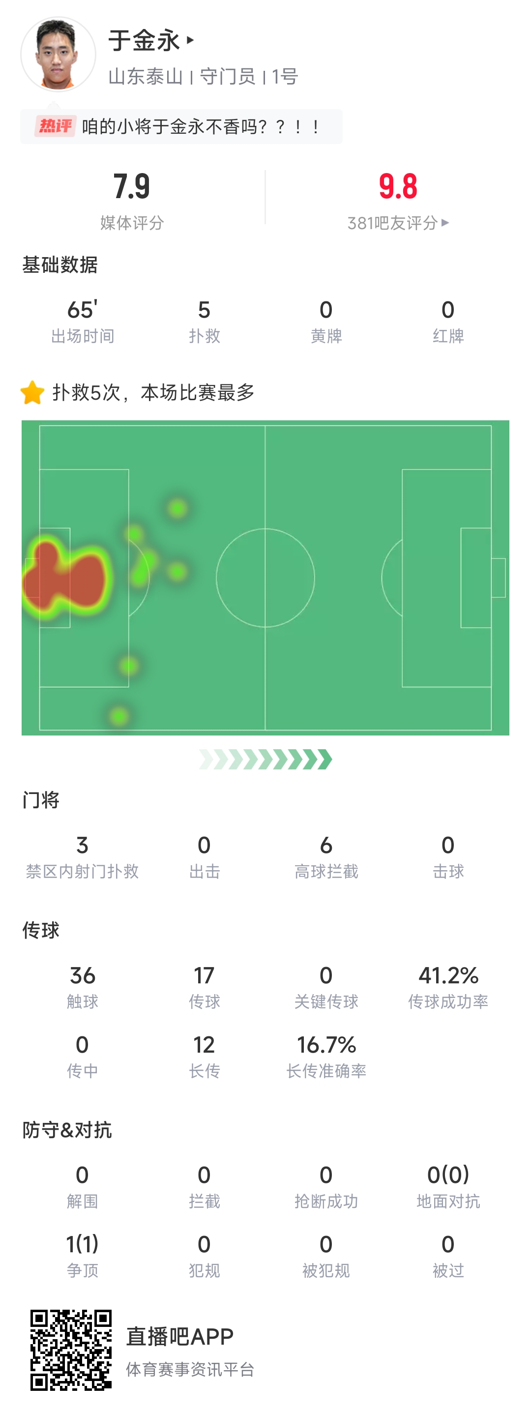 02月23日訊 中超第1輪,山東泰山主場(chǎng)0-0戰(zhàn)平河南隊(duì),在首發(fā)門將王大雷第23分鐘就被紅牌罰下的情況下,20歲的替補(bǔ)門將于金永臨危救主,全場(chǎng)貢獻(xiàn)5次撲救,力保球門不失。