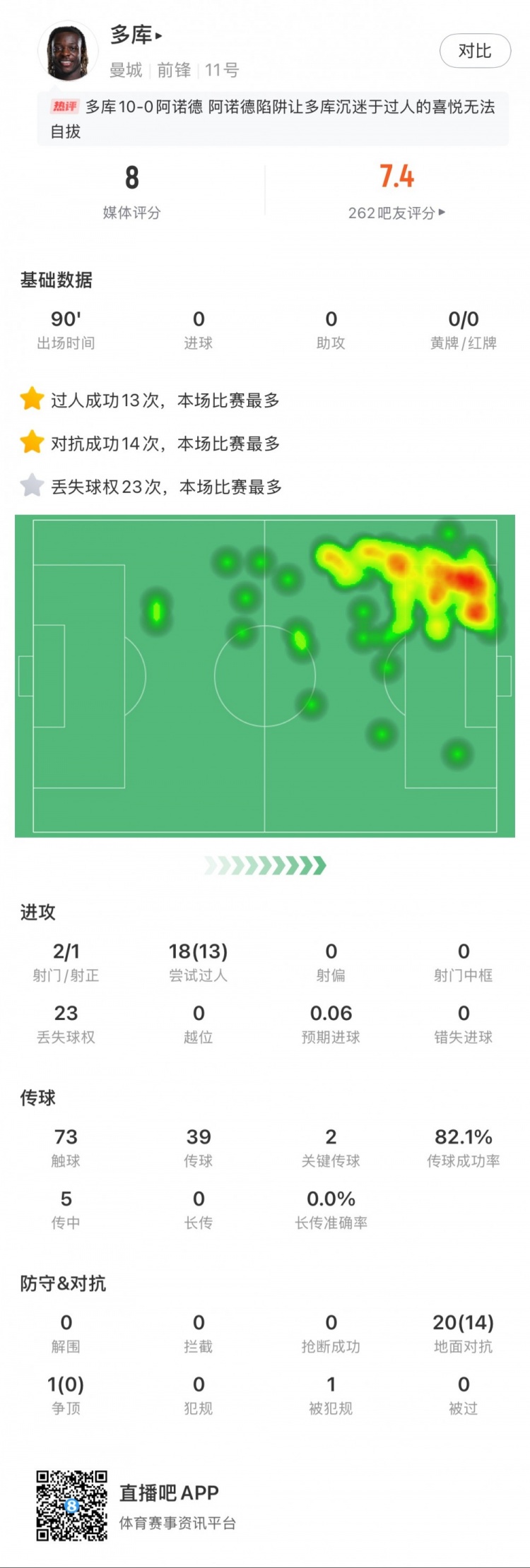 2月24日訊 本輪英超,曼城0-2利物浦。多庫本場數(shù)據(jù):