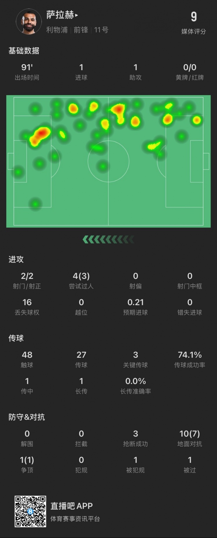 薩拉赫本場:傳射建功!4次過人成功3次,獲評9分全場最高