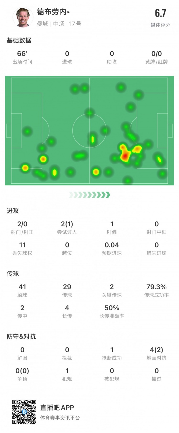 德布勞內(nèi)本場數(shù)據(jù):2次射門0次射正,2次關(guān)鍵傳球,1次搶斷