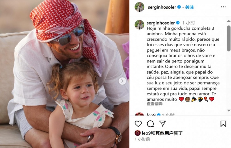 塞爾吉尼奧社媒為女兒慶生:小胖妞三歲了,我們深深愛著你??
