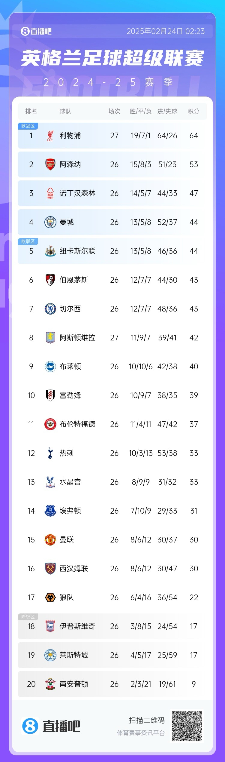 02月24日訊 本輪英超,利物浦2-0雙殺曼城。積分榜上,利物浦已賽27場64分領(lǐng)跑,阿森納已賽26場53分第二。