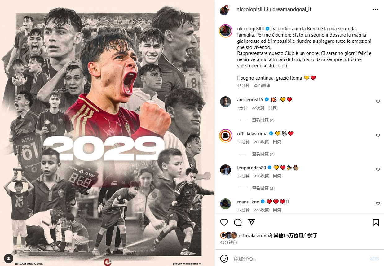 在續(xù)約官宣后皮西利更新了社媒,曬出自己續(xù)約成功的海報(bào),并配文寫道:“這12年來(lái),羅馬一直是我第二個(gè)家,穿上羅馬球衣一直是我的夢(mèng)想,現(xiàn)在我激動(dòng)的心情難以言述。能夠代表羅馬出戰(zhàn),我感到非常榮幸,雖然一路走來(lái)有歡笑,也有苦澀,但我會(huì)為了球隊(duì)付出所有。夢(mèng)想仍在繼續(xù),謝謝你,羅馬?!?/p>