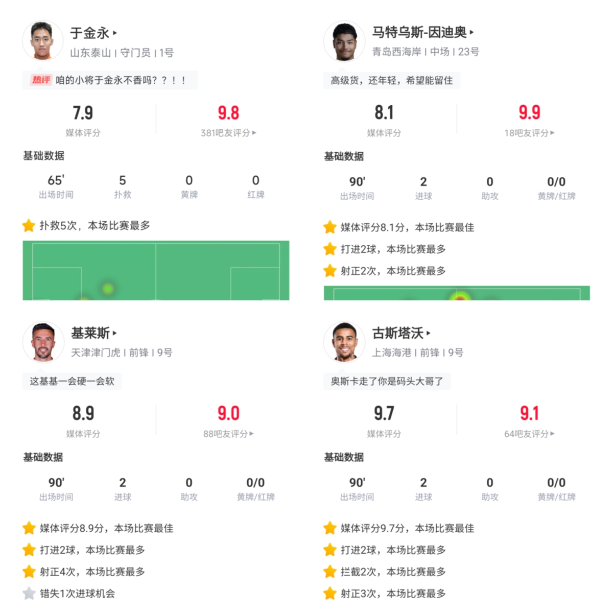 【直播吧】中超首輪最佳球員:于金永險勝,得票率僅多基萊斯1.7%