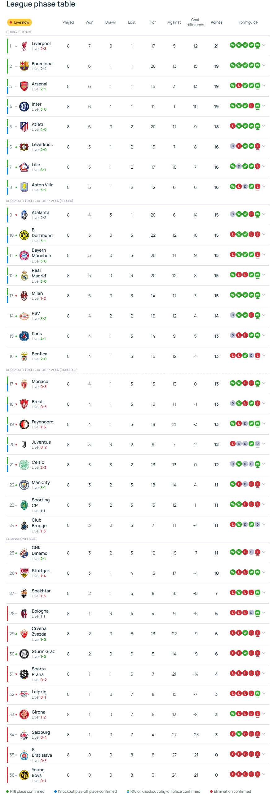 歐冠實(shí)時(shí)積分榜:利物浦巴薩槍手前三,曼城升第22進(jìn)附加賽區(qū)
