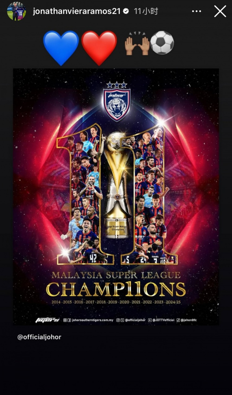 24日進(jìn)行的馬來西亞超級聯(lián)賽第22輪比賽,柔佛新山主場2-0擊敗霹靂,提前4輪問鼎本賽季冠軍。賽后,比埃拉曬出了奪冠的海報(bào),并附上了多個(gè)表情慶祝柔佛新山提前奪冠。