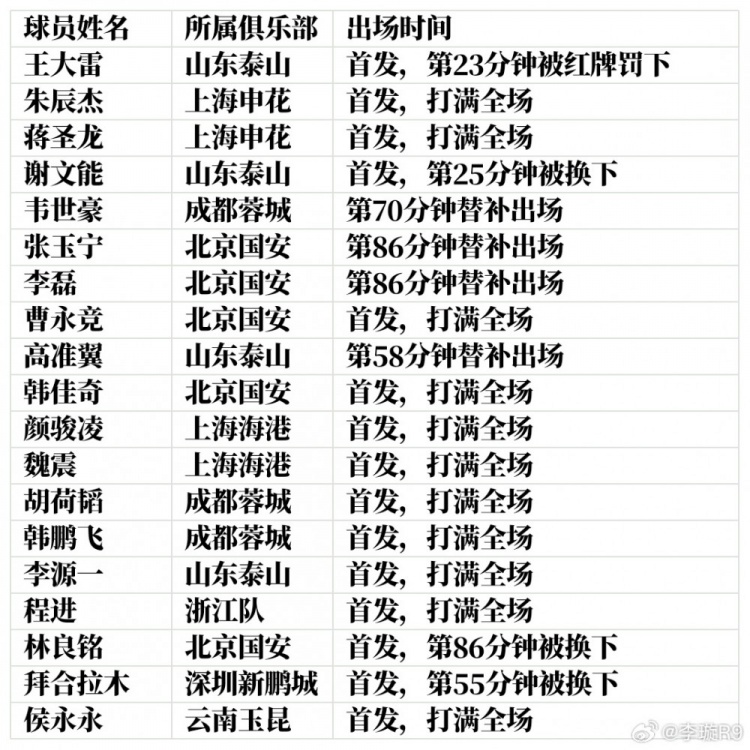 2月25日訊 中超聯(lián)賽首輪戰(zhàn)罷,媒體人李璇統(tǒng)計了國足1月集訓名單中國腳的出場情況,共有13人未在中超首輪出場。