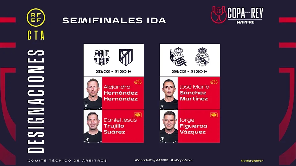 2月25日訊 西班牙足協(xié)日前公布了國(guó)王杯兩場(chǎng)半決賽首回合的裁判名單,具體如下: