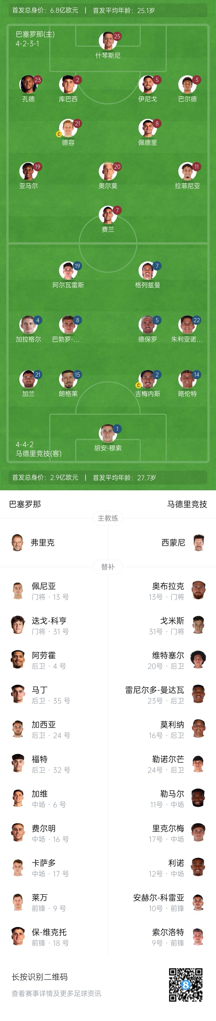 巴薩首發(fā):25-什琴斯尼、2-庫巴西、3-巴爾德、5-伊尼戈-馬丁內(nèi)斯、23-孔德、8-佩德里、20-奧爾莫、21-德容、7-費(fèi)蘭-托雷斯、11-拉菲尼亞、19-亞馬爾