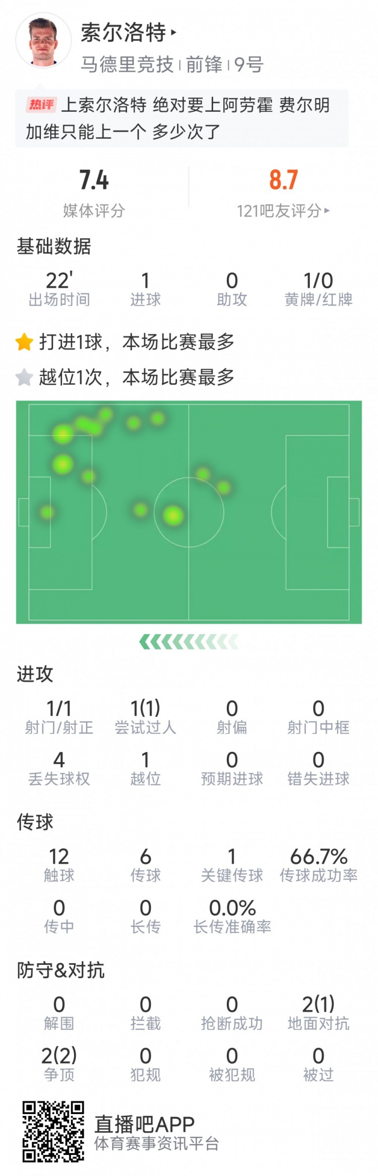 2月26日訊 在本輪國王杯馬競4-4巴薩的比賽中,索爾洛特替補(bǔ)登場打進(jìn)絕平進(jìn)球。以下為他在本場數(shù)據(jù):